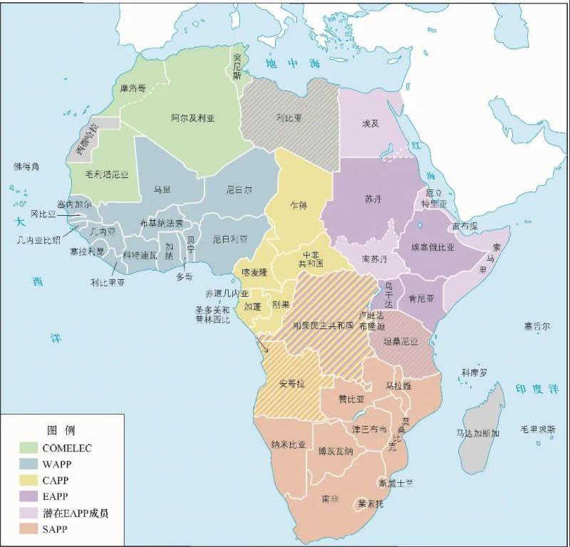 非洲已經(jīng)成立五大區(qū)域電力池,包括北部非洲電力池(COMELEC),東部非洲電力池(EAPP)、西部非洲電力池(WAPP)、中部非洲電力池(CAPP)和南部非洲電力池(SAPP),如圖6所示。