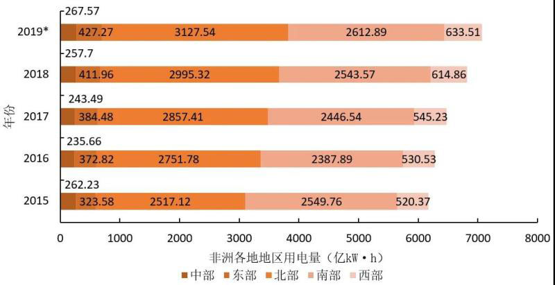 圖5 2015-2019年非洲各地區(qū)用電量