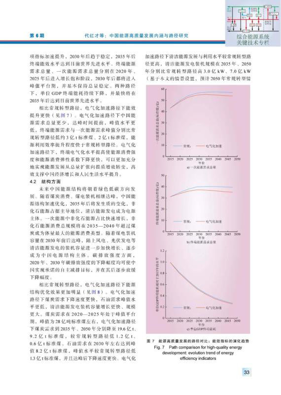 電氣化加速在能源高質(zhì)量發(fā)展中起到至關(guān)重要的作用。從供應(yīng)角度來看,隨著風(fēng)能、太陽能的開發(fā)利用成本持續(xù)降低,未來清潔能源成為一次能源供應(yīng)主體是大勢所趨,而清潔能源往往需要轉(zhuǎn)換為電能得以利用,或以電力為配置載體進(jìn)一步轉(zhuǎn)換為熱能、氫能等能源形式。從需求角度來看,電力具有終端利用效率高、終端使用無排放、基本不存在對外依存的特點(diǎn),將成為能源消費(fèi)的主要形態(tài),化石能源最終將逐步回歸工業(yè)原材料屬性。因此,相對常規(guī)轉(zhuǎn)型路徑,電氣化加速路徑在能效、結(jié)構(gòu)、安全保障等方面都表現(xiàn)出更加符合能源高質(zhì)量發(fā)展要求的特征,是中國能源實(shí)現(xiàn)高質(zhì)量發(fā)展的必然選擇。