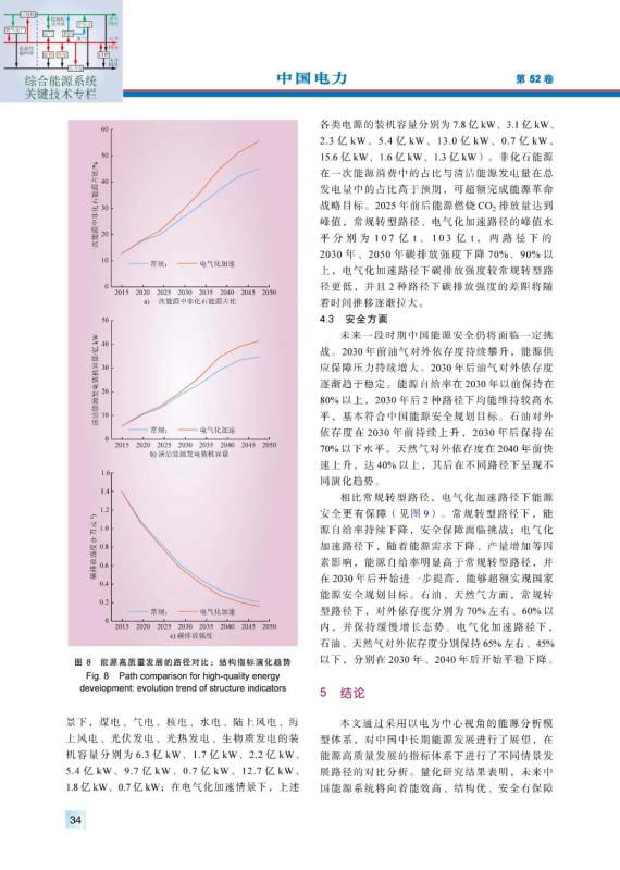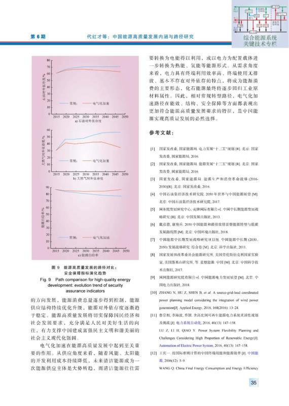 結(jié)論:本文通過采用以電為中心視角的能源分析模型體系,對中國中長期能源發(fā)展進(jìn)行了展望,在能源高質(zhì)量發(fā)展的指標(biāo)體系下進(jìn)行了不同情景發(fā)展路徑的對比分析。量化研究結(jié)果表明,未來中國能源系統(tǒng)將向著能效高、結(jié)構(gòu)優(yōu)、安全有保障的方向發(fā)展,能源消費(fèi)總量逐步得到控制,能源供應(yīng)結(jié)構(gòu)持續(xù)優(yōu)化升級,能源對外依存度逐漸趨于穩(wěn)定。能源高質(zhì)量發(fā)展將切實(shí)保障國民經(jīng)濟(jì)和社會發(fā)展要求,充分滿足人民對美好生活的向往,有力支撐中國建成富強(qiáng)民主文明和諧美麗的社會主義現(xiàn)代化強(qiáng)國。