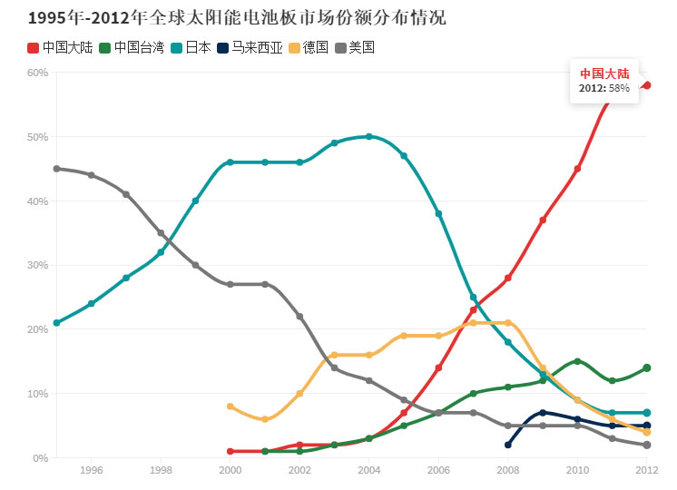 在本世紀(jì)初,德國(guó)還是全球最大的太陽(yáng)能電池板市場(chǎng)和技術(shù)先驅(qū)。在得到了大額的資金支持后,德國(guó)的太陽(yáng)能產(chǎn)業(yè)在21世紀(jì)頭十年中期經(jīng)歷了可觀的發(fā)展。但是當(dāng)投資大幅削減以及低廉的中國(guó)太陽(yáng)能光伏組件進(jìn)入市場(chǎng)后,德國(guó)太陽(yáng)能產(chǎn)業(yè)崩潰了,成千上萬(wàn)人失去了工作,Q-Cells、Solon、Conergy和SolarWorld等主要企業(yè)也紛紛倒閉。