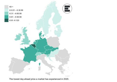 在2020年的前9個月,歐洲電價持續(xù)低于零的時間比2019年增長了一倍多。平均而言,歐洲電力價格在此期間為-0.8%。
