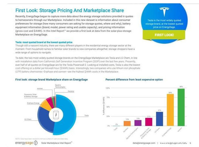 太陽能屋頂和儲能系統(tǒng)在線比較購物市場EnergySage最近發(fā)布的報告揭示了一些令人難以置信的東西。盡管特斯拉能源公司低調(diào)發(fā)展,但Powerwall 2實際上已經(jīng)主導(dǎo)了美國的家用電池存儲市場,而且競爭遠遠談不上激烈。