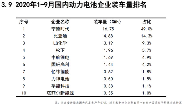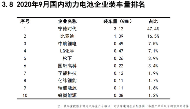 企業(yè)方面,2020年9月,我國(guó)新能源汽車市場(chǎng)共計(jì)51家動(dòng)力電池企業(yè)實(shí)現(xiàn)裝車配套。排名前3家、前5家、前10家動(dòng)力電池企業(yè)動(dòng)力電池裝車量分別為4.7GWh、5.4GWh和6.1GWh,占總裝車量比分別為71.4%、82.4%和92.2%。