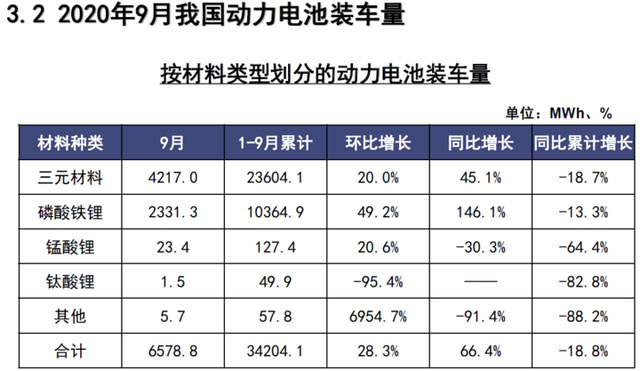 9月,我國(guó)動(dòng)力電池銷量共計(jì)6.9GWhGWh,同比增長(zhǎng)18.6%。其中三元電池銷售3.5GWh,同比下降17.5%,占總銷量50.4%;磷酸鐵鋰電池銷售3.4GWhGWh,同比增長(zhǎng)121.1%,占總銷量49.5%。