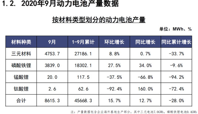 9月,我國(guó)動(dòng)力電池產(chǎn)量共計(jì)8.6GWh,同比增長(zhǎng)12.7%,環(huán)比增長(zhǎng)15.7%。其中三元電池產(chǎn)量4.8GWh,占總產(chǎn)量55.2%,同比增長(zhǎng)0.7%,環(huán)比增長(zhǎng)8.8%;磷酸鐵鋰電池產(chǎn)量3.8GWh,占總產(chǎn)量44.6%,同比增長(zhǎng)34.0%,環(huán)比增長(zhǎng)27.5%。