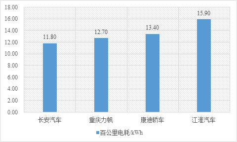 對于A0-CAR車型,選取長安汽車、重慶力帆、康迪轎車、江淮汽車作為典型企業(yè),可知江淮汽車百公里耗電最高,達(dá)15.90kWh,長安汽車百公里耗電最低,為11.80kWh,兩者相差4.1千瓦時(shí)(如圖3所示)。