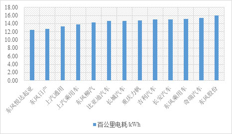 對于A-CAR車型,其百公里電耗分布較為穩(wěn)定,分布范圍為12.5kWh~16.00kWh,其中,東風(fēng)股份百公里電耗最高,為16.00kWh,東風(fēng)悅達(dá)起亞百公里電耗最底,為12.50kWh,分布較為穩(wěn)定(如圖5所示)。