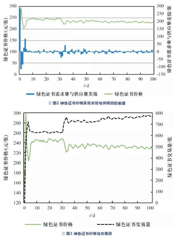 仿真周期內(nèi),售電商期望購買的綠證數(shù)量和可再生能源發(fā)電商期望銷售的綠證數(shù)量之間的差值與綠色證書的價格如圖2所示,綠證成交量如圖3所示。由圖2中綠線可知,綠色證書的價格在初期變化較大。這是因為在第一天時,可再生能源發(fā)電商在現(xiàn)貨市場中標(biāo)量為0,也就意味著此時綠色證書市場中無綠證供應(yīng),此時供遠小于求,需求量與供給量的差值達到最大值,使得綠色證書價格由初始值(150元/張)急速上漲至最大值(300元/張)。由于第二日綠色證書價格達到最大值,超過了售電商預(yù)期購買價格(165元/張),因此售電商會減少對綠證的購買。此時綠證價格遠超可再生能源發(fā)電商預(yù)期出售價格(144元/張),因此發(fā)電商會大幅度增加供應(yīng)量,使得供大于求,從而使得綠色證書的價格有所回落。在后期綠色證書價格略有波動,但基本穩(wěn)定在230元/張附近,價格的波動幅度與綠色證書需求量與供給量的差值呈正比例關(guān)系。隨著仿真天數(shù)的推移,綠色證書的供需差整體呈現(xiàn)一正一負來回交叉變化的趨勢,且幅度逐漸降低,反映在綠色證書價格上則是趨于平穩(wěn)。