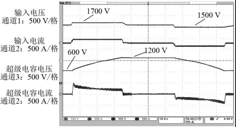 由于試驗條件的限制,利用容量為500 kW的PWM整流器作為列車模擬源,測試儲能裝置的充放電特性,試驗波形如圖5所示。PWM整流器設(shè)定為功率源特性,以發(fā)出500 kW功率模擬列車制動工況,儲能裝置檢測到直流電壓升高到1700 V時進入降壓斬波模式,超級電容的電壓從初始電壓600 V充電至1200 V;再以吸收500 kW功率模擬列車牽引工況,儲能裝置檢測到直流電壓降低到1500 V時進入升壓斬波模式,超級電容的電壓從初始1200 V放電至600 V。