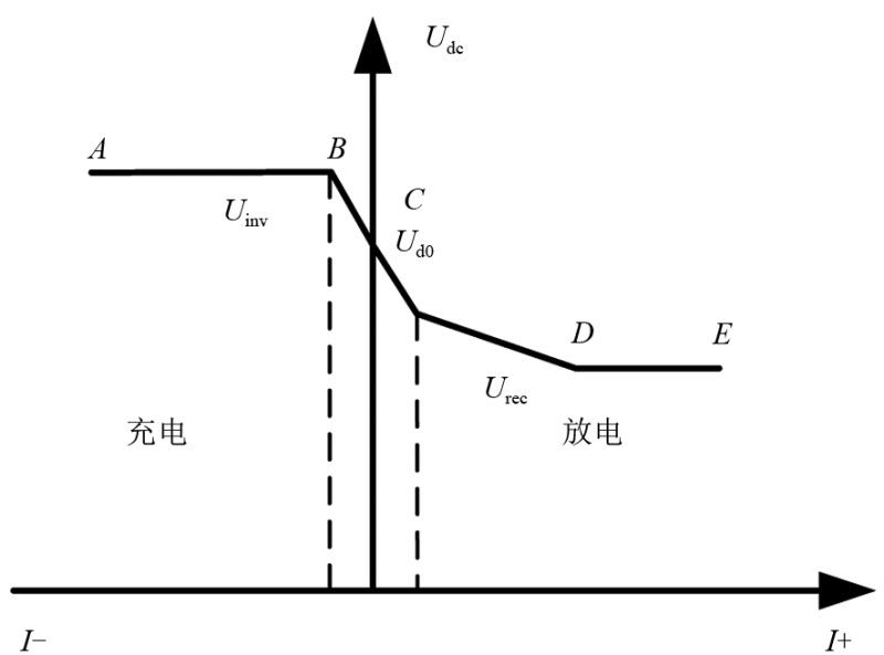 儲能裝置的控制特性需考慮與整流機組和列車的配合,如圖4所示,CD段為整流機組外特性曲線,ABC段為儲能裝置充電特性曲線、DE段為放電特性曲線。