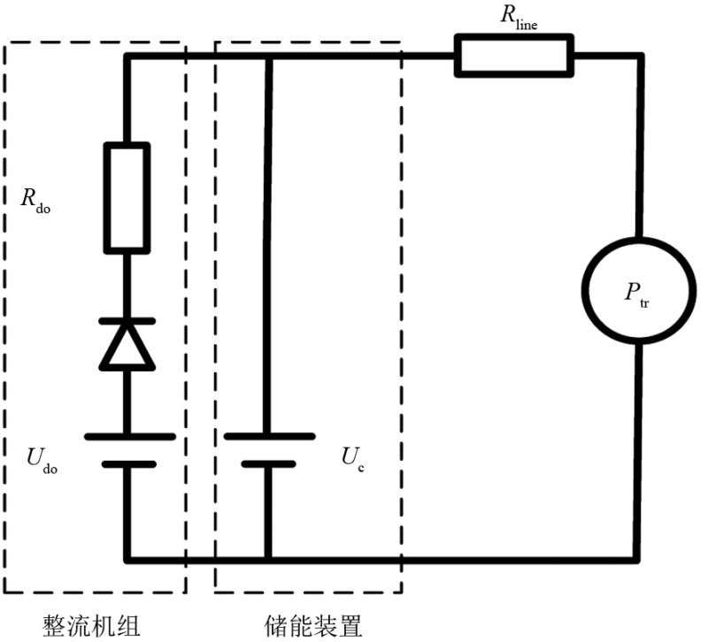 建立列車、整流機組和儲能裝置的電氣模型,如圖3所示。整流機組的模型為電壓源與電阻的串聯(lián),考慮到整流器僅具備單向變流能力,模型中需要串入二極管以防止整流機組電流反向,Ud0為整流機組的空載電壓,Rd0為等效內(nèi)阻。列車的模型為功率源,功率的大小由列車的運行狀態(tài)決定,根據(jù)牽引計算過程得到。儲能裝置的模型為電壓源,Uc為穩(wěn)壓值,當超級電容充電時穩(wěn)壓值需高于空載電壓且低于系統(tǒng)允許最高電壓,當超級電容放電時穩(wěn)壓值需低于空載電壓且高于系統(tǒng)允許最低電壓。Rline為牽引網(wǎng)的線路電阻,由單位長度阻抗和線路長度決定。
