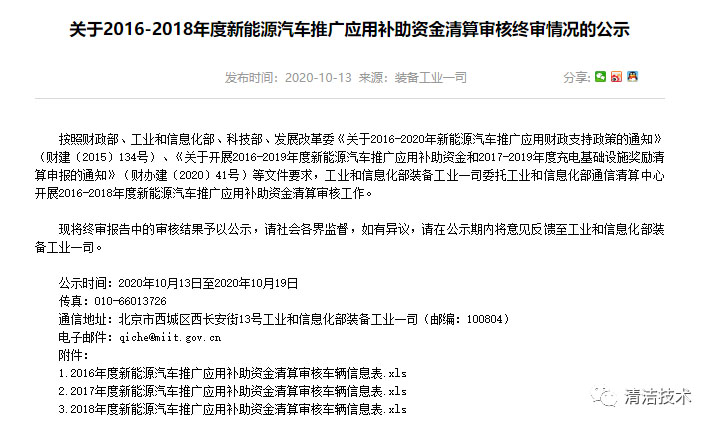 工信部2020年10月13日發(fā)布:關于2016-2018年度,新能源汽車推廣應用補助資金清算審核終審情況的公示。公示內容如下截圖: