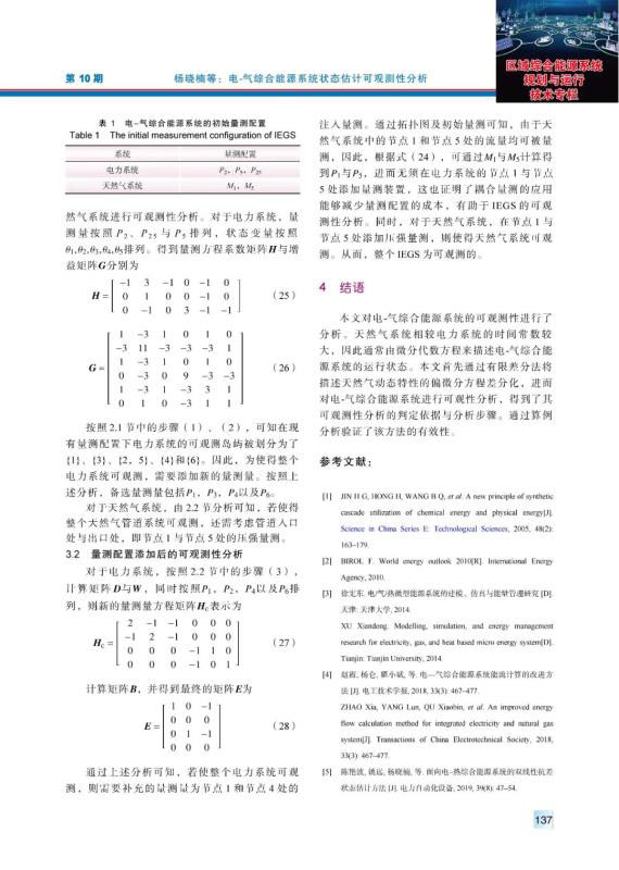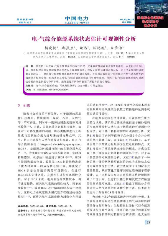 楊曉楠, 郎燕生, 姚遠(yuǎn), 等. 電-氣綜合能源系統(tǒng)狀態(tài)估計(jì)可觀測性分析[J]. 中國電力, 2020, 53(10): 133-139.