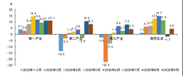 前三季度,三次產(chǎn)業(yè)和居民生活用電量同比分別增長(zhǎng)9.0%、-0.4%、-0.9%、5.2%,增速較上半年分別變化1.1、2.9、3.8、-0.6個(gè)百分點(diǎn),第二、第三產(chǎn)業(yè)用電量加快恢復(fù)。前三季度,三次產(chǎn)業(yè)和居民生活用電量貢獻(xiàn)率分別為19.6%、-50.5%、-32.6%和163.5%,居民生活用電是拉動(dòng)用電增長(zhǎng)的主要?jiǎng)恿Α?月份,國(guó)家電網(wǎng)經(jīng)營(yíng)區(qū)三次產(chǎn)業(yè)和居民生活用電量分別為64億、3102億、911億、887億千瓦時(shí),同比分別增長(zhǎng)11.1%、8.2%、4.3%、4.5%。