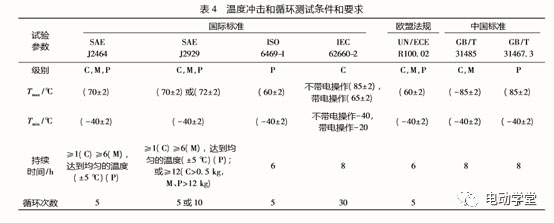 此試驗(yàn)主要評(píng)估由于暴露于極端和突然的溫度變化(例如,在運(yùn)輸過(guò)程中車輛進(jìn)入或離開加熱或冷凍的車庫(kù)時(shí),導(dǎo)致電池組件的膨脹和收縮)而引起的DUT完整性的變化。在溫度沖擊和循環(huán)試驗(yàn)期間,DUT會(huì)經(jīng)受高溫和低溫兩個(gè)溫度限值,并在每個(gè)溫度限值下保持指定的時(shí)間。標(biāo)準(zhǔn)和法規(guī)中描述的溫度沖擊和循環(huán)測(cè)試具有不同的最高溫度限制(請(qǐng)參見(jiàn)表4)。所有標(biāo)準(zhǔn)和法規(guī)的溫度下限均為-40°C(IEC62660-2在帶電操作情況,是最低溫度為-20℃),盡管溫度上限不相同。