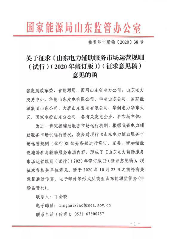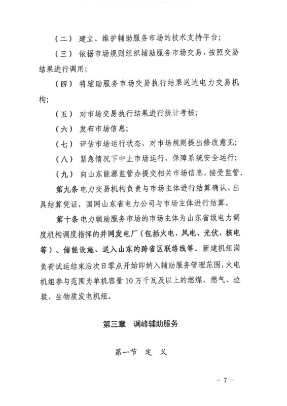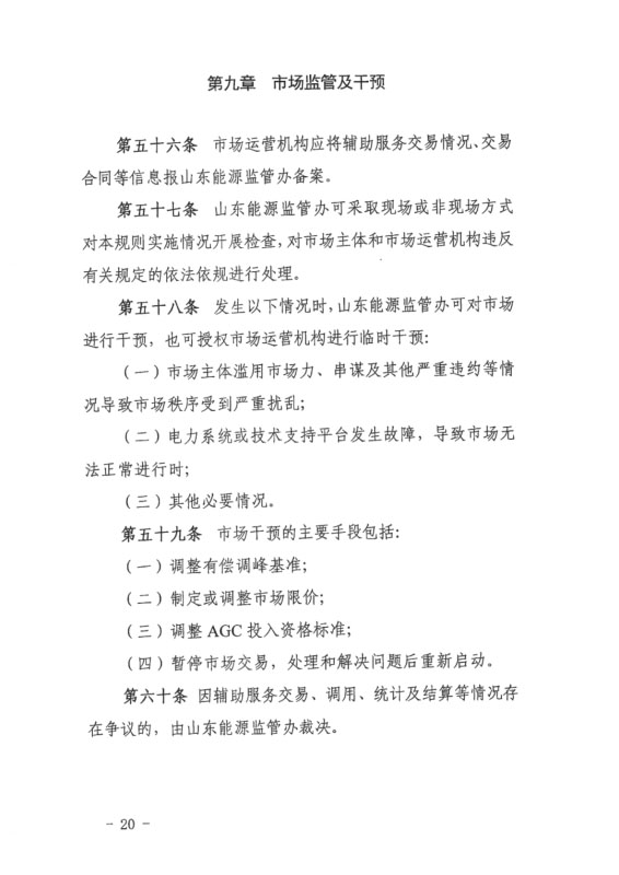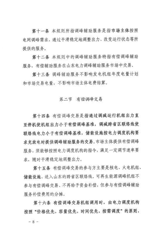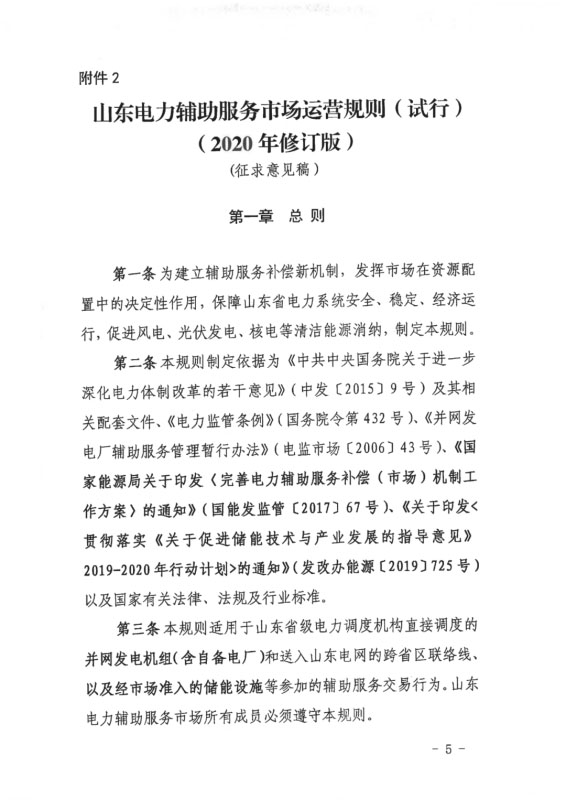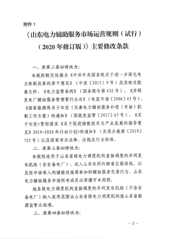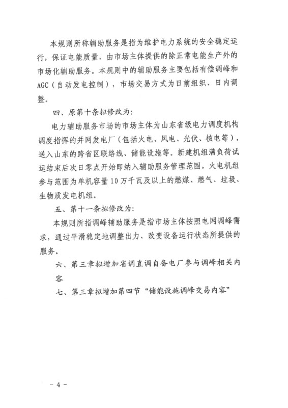 今日,國家能源局山東能監(jiān)局發(fā)布《山東電力輔助服務(wù)市場運(yùn)營規(guī)則(試行)(2020年修訂版)》(征求意見稿),意見稿指出,在發(fā)電機(jī)組相關(guān)定義中新增儲(chǔ)能設(shè)施、并新增儲(chǔ)能設(shè)施調(diào)峰交易章節(jié)內(nèi)容,其中指出規(guī)模在5MW/10MWh及以上獨(dú)立儲(chǔ)能設(shè)施、集中式新能源場站配套儲(chǔ)能設(shè)施等均可參與。