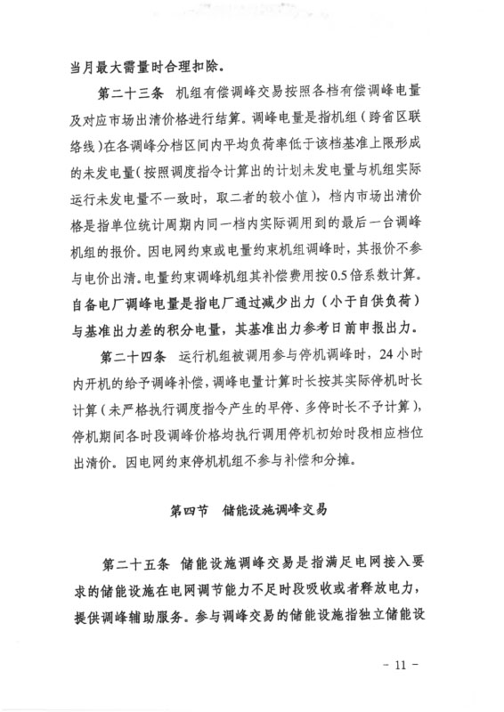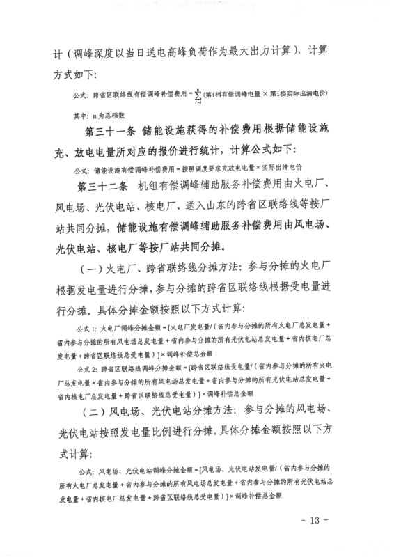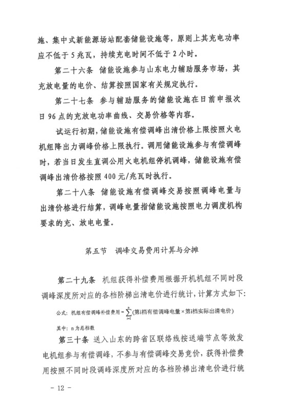 儲(chǔ)能設(shè)施參與山東電力輔助服務(wù)市場,其充放電量的電價(jià)、結(jié)算按照國家有關(guān)規(guī)定執(zhí)行。調(diào)用儲(chǔ)能設(shè)施參與有償調(diào)峰時(shí),若當(dāng)日發(fā)生直調(diào)公用火電機(jī)組停機(jī)調(diào)峰,儲(chǔ)能設(shè)施有償調(diào)峰出清價(jià)格按照400元/MWh執(zhí)行。儲(chǔ)能設(shè)施有償調(diào)峰輔助服務(wù)補(bǔ)償費(fèi)用由風(fēng)電場、光伏電站、核電廠等按場站共同分?jǐn)?。有償調(diào)峰交易機(jī)組調(diào)用時(shí),火電機(jī)組因參與調(diào)峰出力運(yùn)行至50%及以下時(shí),優(yōu)先調(diào)用儲(chǔ)能設(shè)施。