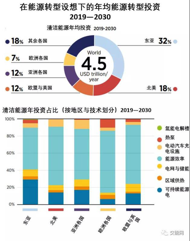 對能源轉(zhuǎn)型的投資是復(fù)蘇一攬子計(jì)劃中一個(gè)重要的部分。使得在未來三年及以后提振經(jīng)濟(jì)的同時(shí),在廣泛的職業(yè)中創(chuàng)造就業(yè)機(jī)會。"能源轉(zhuǎn)型設(shè)想"指出,從現(xiàn)在起到2030年,能源部門在可再生能源和能源效率方面累計(jì)投資必須上升到49萬億美元。因此意味著到2030年,在可再生能源、能源效率和低碳促進(jìn)技術(shù)方面每年的投資約為4.5萬億美元,包括電網(wǎng)和存儲等基礎(chǔ)設(shè)施。這一數(shù)字是2019年可再生能源技術(shù)、能源效率和電網(wǎng)(包括存儲系統(tǒng))投資8250億美元的5倍以上。這將意味著投資需求的數(shù)量和投資需求類型的改變,因?yàn)閷δ茉催^渡的投資,使基礎(chǔ)設(shè)施和能源效率增加,而礦物燃料供應(yīng)的投資減少。