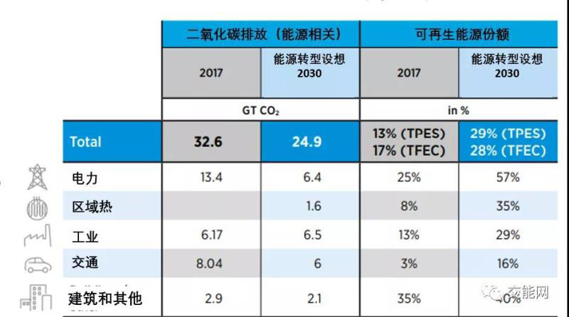 "能源轉(zhuǎn)型設(shè)想"將二氧化碳排放量減少至與全球氣候和能源目標(biāo)一致的水平。但要實(shí)現(xiàn)這個(gè)目標(biāo),需要實(shí)現(xiàn)能源供需的改變。 利用可再生能源成為世界能源系統(tǒng)脫碳的先決條件。根據(jù)"能源轉(zhuǎn)型設(shè)想",到2030年,可再生能源將提供全球發(fā)電量的57%,而2017年為25%(預(yù)計(jì)2020年為30%)。風(fēng)能和太陽能光伏發(fā)電在發(fā)電量方面將占據(jù)主導(dǎo)地位,到2030年,全球三分之一的電力來自太陽能和風(fēng)能。到2030年,建筑部門在可再生能源中所占的份額將最高(40%,所有傳統(tǒng)生物燃料的使用將逐步淘汰)(見下表)。第二高的可再生能源份額將是在工業(yè)(包括高爐和焦?fàn)t),到2030年,可再生能源將占29%的份額。交通運(yùn)輸業(yè)所占份額最低,但增長最大,從2017年的3%攀升到2030年的16%。