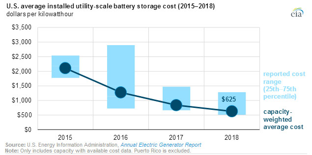 中國儲能網訊:根據美國能源信息管理局最近發(fā)布的《發(fā)電設施的年度報告》,美國電網規(guī)模電池儲能系統(tǒng)的平準化成本已從2015年的2,152美元/kWh迅速降到2018年的625美元/kWh。電池儲能系統(tǒng)可以存儲由發(fā)電設施產生或直接從電網獲取的電力,然后根據需要重新分配電力。截至2018年底,美國已經部署的電池儲能系統(tǒng)的裝機容量為869MW,儲能容量為1,236MWh。