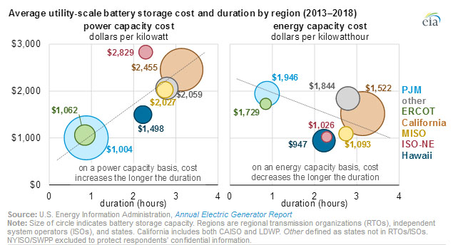 電池儲能系統(tǒng)的部署成本因地區(qū)和應用場景而異。美國的電力系統(tǒng)主要由獨立系統(tǒng)運營商(ISO)和區(qū)域輸電組織(RTO)管理和運行。為了了解電池儲能系統(tǒng)成本如何根據部署的位置而發(fā)生變化,美國能源信息管理局(EIA)將加利福尼亞州的獨立系統(tǒng)運營商(ISO)和區(qū)域輸電組織(RTO)匯總在一起,以避免在電池儲能系統(tǒng)部署較少的地區(qū)披露受訪者的機密信息。在區(qū)域市場層面,2013年至2018年的電網規(guī)模電池儲能系統(tǒng)的平均成本各不相同,例如PJM互聯(lián)公司的成本為1946美元/ kWh,而夏威夷電力公司的成本為947美元/ kWh。