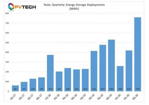 特斯拉公司在其2020年第三季度的財(cái)務(wù)業(yè)績報(bào)告中指出,該公司儲(chǔ)能產(chǎn)品的部署和銷售量顯著增加,第三季度達(dá)到759MWh。這與第二季度相比增長了81%,比去年同期相比增長了59%。特斯拉公司預(yù)計(jì),用戶采購儲(chǔ)能系統(tǒng)的需求在2021年將超過供應(yīng)量。再加上住宅太陽能系統(tǒng)的部署量比上一季度翻了一番,該公司的住宅太陽能和儲(chǔ)能系統(tǒng)在2020年第三季度的收入為5.79億美元,同比增長44%。