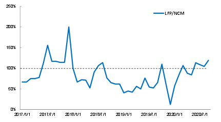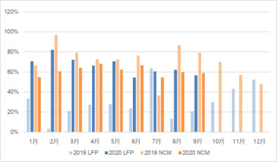 2020年在對(duì)三元高鎳的“不友好”氣氛下,市場一度過于悲觀,認(rèn)為高鎳三元比例不會(huì)過高,但從CATL的數(shù)據(jù)來看,2020年1-9月高鎳平均市占率也能達(dá)到42%。