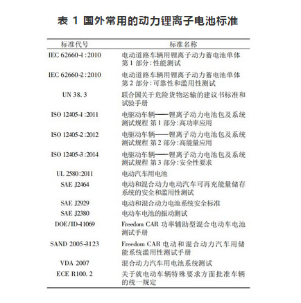 表 1 國(guó)外常用的動(dòng)力鋰離子電池標(biāo)準(zhǔn)