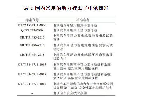 表 2 國(guó)內(nèi)常用的動(dòng)力鋰離子電池標(biāo)準(zhǔn)