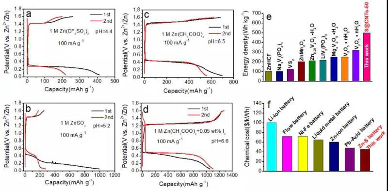 圖2 S@CNTs-50 電極的電化學(xué)性能。S@CNTs-50在(1)1 M Zn(CF3SO3)2,(2) 1 M ZnSO4,(3) 1 M Zn(CH3COO)2 和(d)1 M Zn(CH3COO)2+ I2鋅溶液中的充放電曲線。S@CNTs-50電極的(e)能量密度和(f)材料成本與報(bào)道的體系的比較。