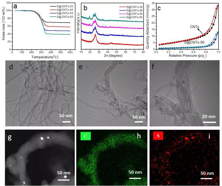 圖1 樣品的結(jié)構(gòu)表征。不同硫碳復(fù)合材料的(a)TG和(b)XRD圖譜。(c)S@CNTs-50和CNTs的氮?dú)馕摳角€,(d)CNTs 的TEM照片,(e,f)S@CNTs-50 的TEM照片,和(g-h)S@CNTs-50的TEM mapping。