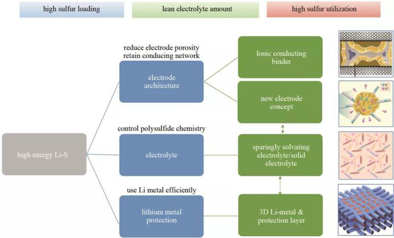 鋰硫電池所面臨的挑戰(zhàn)與鋰硫電池中特殊的化學(xué)反應(yīng)相關(guān):一方面,鋰硫電池的快速可逆反應(yīng)需要依賴溶解的多硫化鋰作為反應(yīng)媒介,提高硫正極的反應(yīng)動(dòng)力學(xué);另一方面,多硫化鋰的溶解又是鋰硫電池中各種困難問題產(chǎn)生的原因,如“穿梭”效應(yīng)、正極硫的重新分布、金屬鋰的腐蝕等。單一的方案可能難以全面解決鋰硫電池的問題,需要從硫電極結(jié)構(gòu)、電解液(質(zhì))及金屬鋰保護(hù)多方向協(xié)作開發(fā)出能將三者有機(jī)結(jié)合,充分發(fā)揮相互優(yōu)勢(shì)的鋰硫電池體系,如圖6所示。①有效降低硫正極的孔隙率,同時(shí)維持穩(wěn)定的離子/電子導(dǎo)電網(wǎng)絡(luò);②合理調(diào)節(jié)多硫化鋰的化學(xué)行為;③高效、可逆利用金屬鋰負(fù)極是實(shí)現(xiàn)高能量鋰硫電池的重要研究方向。例如,通過開發(fā)與鋰硫電池電極材料兼容的具有離子導(dǎo)電或電子導(dǎo)電能力的黏結(jié)劑以降低導(dǎo)電碳含量和電解液用量;設(shè)計(jì)新的硫正極結(jié)構(gòu)、表面性質(zhì)從而有效控制硫化物反應(yīng)路徑;探索與硫正極結(jié)構(gòu)配套的全新的電解液體系,實(shí)現(xiàn)從微觀/宏觀多尺度上對(duì)硫正極反應(yīng)熱力學(xué)和動(dòng)力學(xué)過程的有效調(diào)控;開發(fā)3D金屬鋰負(fù)極或合金復(fù)合負(fù)極材料提高金屬鋰負(fù)極的化學(xué)、電化學(xué)及結(jié)構(gòu)穩(wěn)定性;開發(fā)全新的固態(tài)鋰硫電池體系從根本上提高硫正極和鋰負(fù)極的均勻性和穩(wěn)定性,解決多硫化鋰溶解、界面鈍化、鋰枝晶及“死鋰”等問題。此外,未來探索出鋰硫電池研究的標(biāo)準(zhǔn)參數(shù),可能有益于加速將鋰硫電池在新型電極結(jié)構(gòu)及電解液(質(zhì))等方向的研究結(jié)果轉(zhuǎn)化為實(shí)際應(yīng)用。