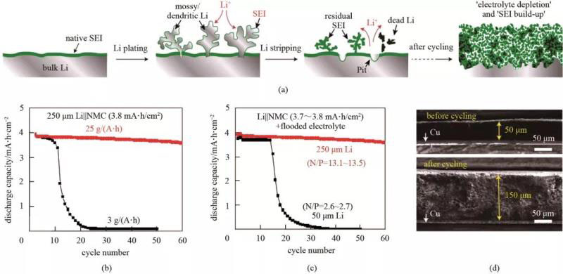 圖5 鋰負(fù)極與金屬鋰電池失效的關(guān)系。(a)金屬鋰溶解-沉積過程的形貌和結(jié)構(gòu)變化示意圖。Li‖NCM電池在不同電解液量;(b)和不同N/P比例;(c)條件下的循環(huán)性能(NCM電極:3.8 mA·h/cm2; C-rate: C/3;電壓:2.7~4.4 V);(d) 50 μm金屬鋰循環(huán)后SEM。圖片復(fù)制許可來自Nature Springer 2019