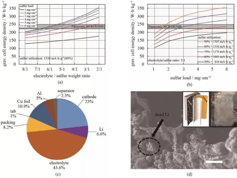 圖4 18650型鋰硫電池在(a)不同載硫量、不同E/S比例條件下能量密度的變化(固定硫利用率80%);(b)不同載硫量、不同硫利用率下能量密度的變化(固定E/S=3);(c)2.5 A·h、300 W·h/kg軟包鋰硫電池中不同電池組分的質(zhì)量分布,其中電解液的質(zhì)量分?jǐn)?shù)約為43.6%;(d)軟包鋰硫電池循環(huán)后金屬鋰負(fù)極的SEM。圖片許可復(fù)制來自Wiley 2015,ACS 2018,Elsevier 2017