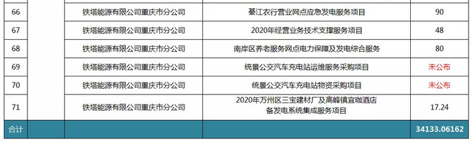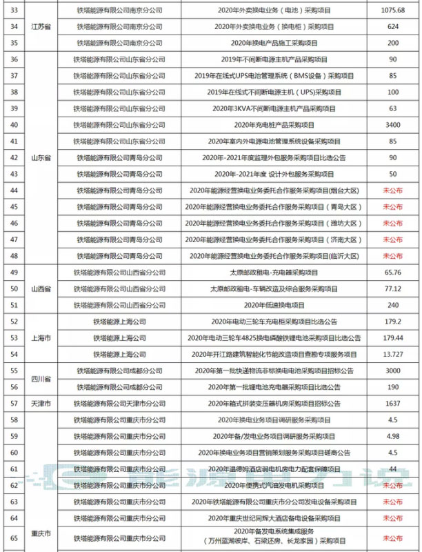 2020年截止至9月30日,鐵塔能源公司共發(fā)布采購(gòu)項(xiàng)目71個(gè),采購(gòu)內(nèi)容主要集中在電池、換電、充電樁、智能充電柜設(shè)備及相關(guān)服務(wù)。除了14個(gè)項(xiàng)目未公布項(xiàng)目預(yù)算之外,項(xiàng)目預(yù)算金額合計(jì)3.4億元。