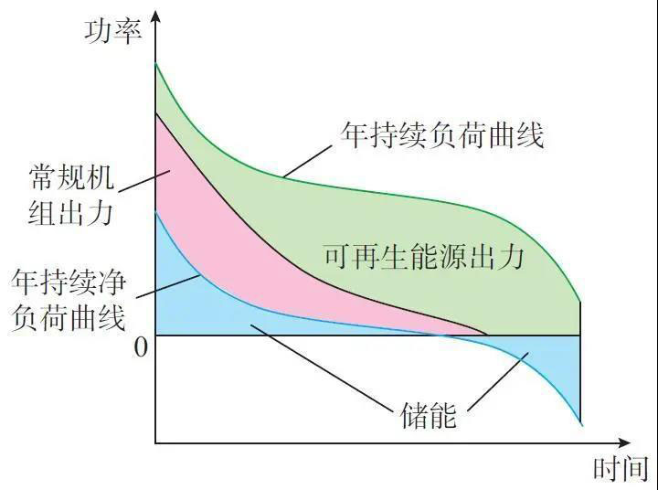 高比例可再生能源電力系統(tǒng)靈活性調(diào)節(jié)資源稀缺,跨區(qū)域互濟逐漸難以解決可再生能源出力與負荷需求的電力電量不平衡問題。圖1所示為電力系統(tǒng)中年持續(xù)凈負荷特性曲線在可再生能源達到一定比例時,系統(tǒng)出現(xiàn)電力富余需儲能參與消納的示意圖。季節(jié)性儲能在電力系統(tǒng)電能富余時將電能轉(zhuǎn)化為其他可長期存儲的能量形式進行儲存,實現(xiàn)跨能源形式的長期儲能與優(yōu)化利用。