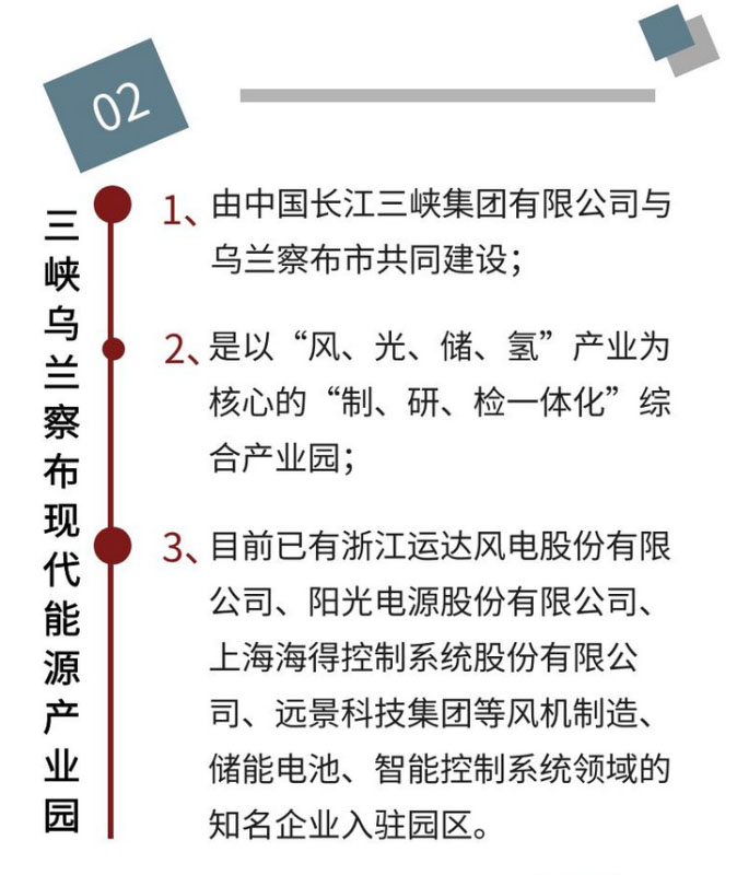 三峽烏蘭察布現(xiàn)代能源產(chǎn)業(yè)園由三峽集團(tuán)與烏蘭察布市共同建設(shè),是以“風(fēng)、光、儲(chǔ)、氫”產(chǎn)業(yè)為核心的“制、研、檢一體化”綜合產(chǎn)業(yè)園,同時(shí)還融合了現(xiàn)代能源技術(shù)、物聯(lián)網(wǎng)技術(shù)和云計(jì)算等新一代信息技術(shù),利用分布式電源和儲(chǔ)能設(shè)備構(gòu)建多種綠色能源互補(bǔ)、多類型儲(chǔ)能綜合利用的智能微網(wǎng)園區(qū)。目前已有浙江運(yùn)達(dá)風(fēng)電股份有限公司、陽光電源股份有限公司、上海海得控制系統(tǒng)股份有限公司、遠(yuǎn)景科技集團(tuán)等風(fēng)機(jī)制造、儲(chǔ)能電池、智能控制系統(tǒng)領(lǐng)域的知名企業(yè)入駐園區(qū),各方強(qiáng)強(qiáng)聯(lián)合,共同推進(jìn)現(xiàn)代能源產(chǎn)業(yè)體系建設(shè)。