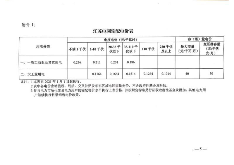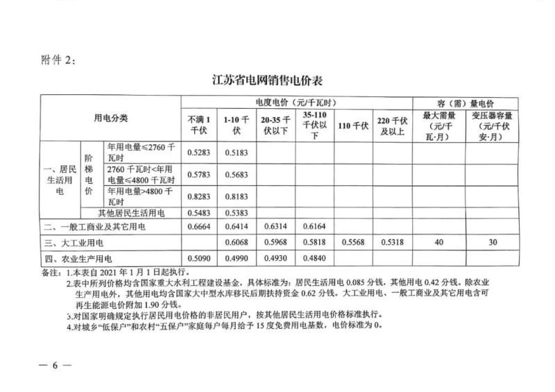 一、江蘇電網(wǎng)各電壓等級(jí)輸配電價(jià)(含增值稅、線損、交叉補(bǔ)貼和華東區(qū)域電網(wǎng)容量電費(fèi),下同)和銷售電價(jià)具體標(biāo)準(zhǔn)詳見附件。