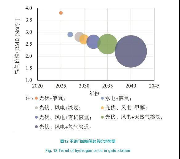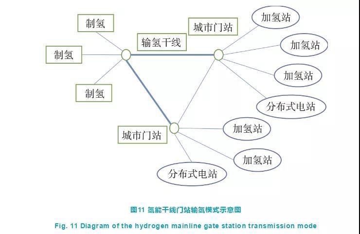 因此,我國(guó)未來(lái)的“干線門(mén)站模式”將會(huì)成為大規(guī)模輸氫的主導(dǎo),如圖11所示。規(guī)?;臍淠軕?yīng)用和氫能供應(yīng)鏈,綠氫通過(guò)輸氫干線到達(dá)城市門(mén)站后,通過(guò)多種儲(chǔ)運(yùn)方式如高壓氣氫、固氫、有機(jī)液氫、以及城市管道輸氫,進(jìn)入城市終端加氫站和小型氫能冷熱電聯(lián)產(chǎn)發(fā)電系統(tǒng),或者其他的用氫終端,完成千公里的干線輸氫和百公里氫能的分輸。