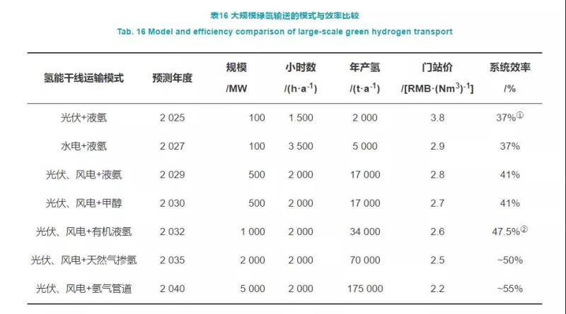 現(xiàn)有的氫氣儲(chǔ)運(yùn)技術(shù),可以提供大規(guī)模氫氣輸送的方式有管道、液氫和化學(xué)儲(chǔ)氫,表16給出了不同規(guī)模下的氫儲(chǔ)運(yùn)模式,對(duì)應(yīng)的經(jīng)濟(jì)性和系統(tǒng)效率: