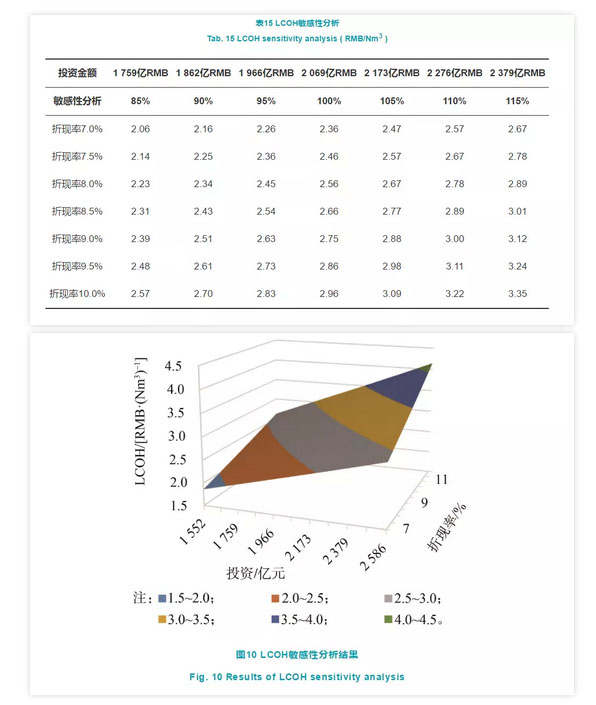 從敏感性分析(見(jiàn)表15和圖10)可以看出,投資對(duì)LCOE的影響顯著,隨著投資變化10%,氫能的LCOE的相應(yīng)有略低于10%變化。