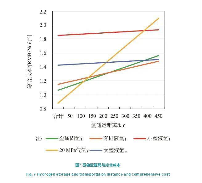 液氫、固氫和有機(jī)氫,在現(xiàn)有條件下固定成本1.0~1.9 RMB/Nm3,超過(guò)TT車(chē)0.9 RMB/Nm3,主要成本在制備和接收兩端,液氫15 kWh/kg的液化能耗、固氫和有機(jī)氫10 kWh/kg的脫氫電耗,直接影響了氫的儲(chǔ)運(yùn)成本。氫氣的運(yùn)輸成本與運(yùn)輸距離的關(guān)系如圖7所示。