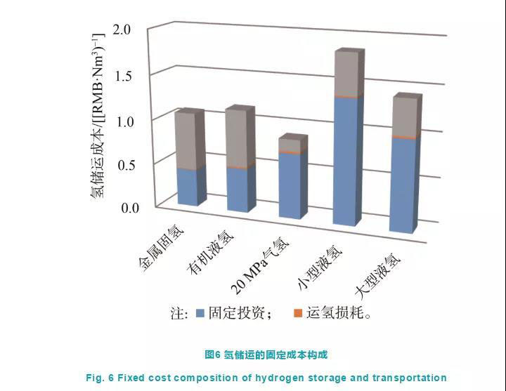 根據(jù)現(xiàn)有資料,已經(jīng)工業(yè)化應(yīng)用20 MPa氣氫TT車(chē)的供應(yīng)鏈,和固氫、液氫、有機(jī)氫的小規(guī)模裝置的情況,規(guī)模在2000 Nm3/h的供應(yīng)能力的條件下,氫氣運(yùn)輸?shù)墓潭ǔ杀敬笾氯鐖D6所示。