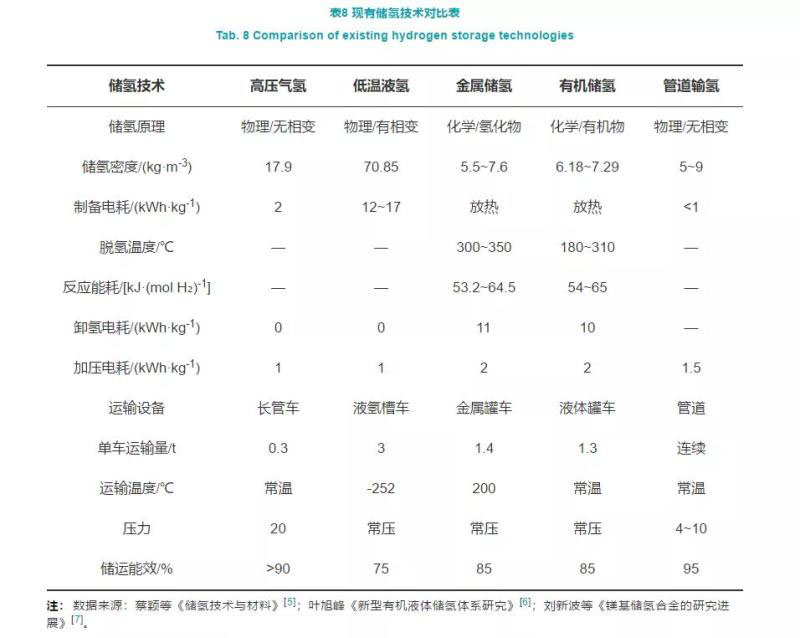 氫氣的儲(chǔ)運(yùn)是比較復(fù)雜的,現(xiàn)有和在研究具備工業(yè)應(yīng)用條件的儲(chǔ)運(yùn)技術(shù),包括高壓氫、液氫、金屬固氫、有機(jī)液氫、管道氫等技術(shù),綜合目前工業(yè)應(yīng)用的實(shí)際情況,氫儲(chǔ)運(yùn)技術(shù)的關(guān)鍵指標(biāo)比較如表8所示。