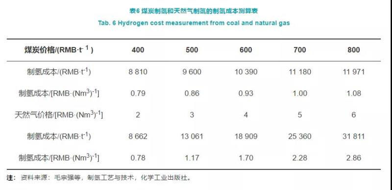 目前已經(jīng)實(shí)現(xiàn)大規(guī)模工業(yè)化制氫的煤化工制氫和天然氣制氫,根據(jù)中國(guó)石油經(jīng)濟(jì)研究院惠州煉油項(xiàng)目測(cè)算的制氫成本大制如表6所示。