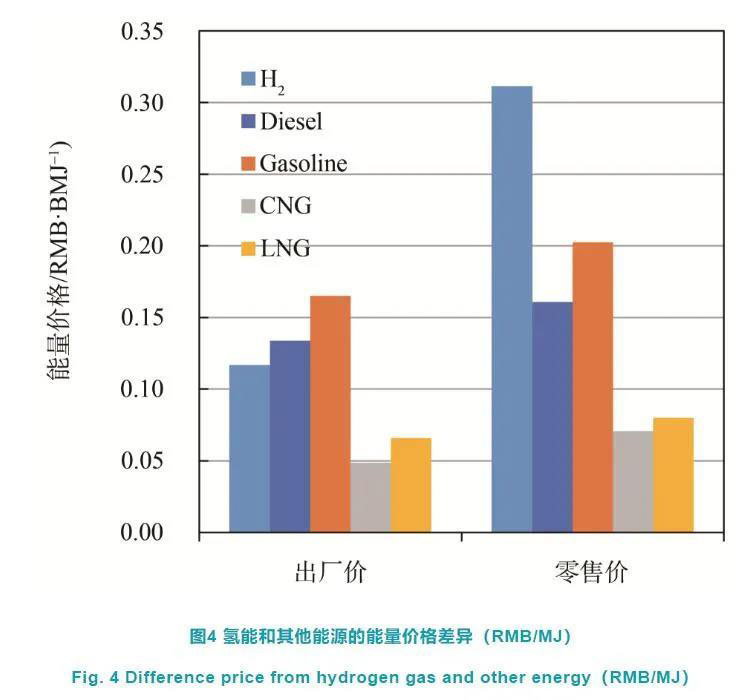 (1)氫能由于較高的利用效率和環(huán)境友好性,作為交通能源具有比較優(yōu)勢(shì),和常規(guī)的汽柴油比較,在低于4.0 RMB/Nm3的終端價(jià)格下,氫能具備大規(guī)模使用的經(jīng)濟(jì)性。