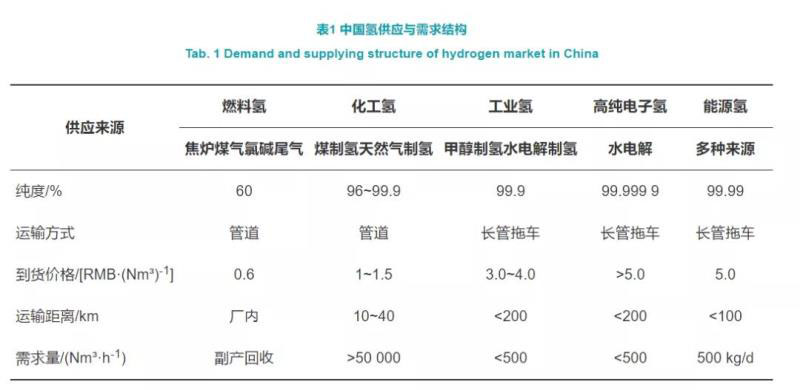氫氣供應(yīng)鏈成本遠(yuǎn)高于天然氣,因而,氫氣的供應(yīng)與使用受運(yùn)輸距離限制,根據(jù)國(guó)內(nèi)的資料顯示(見(jiàn)表1),中國(guó)氫氣的市場(chǎng)大致分為燃料氫、化工氫、能源氫,對(duì)應(yīng)的氫氣市場(chǎng)價(jià)格分別為: