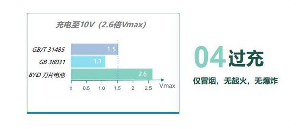 在過充測試中,比亞迪刀片電池以1倍率電流充電至終止電壓的2.6倍時(shí)終止充電,并且在1小時(shí)觀察期內(nèi)沒有出現(xiàn)起火、爆炸等現(xiàn)象。用更高的防過充標(biāo)準(zhǔn)降低由過充引發(fā)自燃的幾率,刀片電池讓新能源汽車的安全性能更上一層樓。