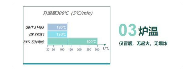 刀片電池使用磷酸鐵鋰材料,耐高溫性能更加優(yōu)異。爐溫測試中,刀片電池在超過國家標(biāo)準(zhǔn)要求溫度2倍多、達(dá)到300°高溫情況下保持30分鐘,期間沒有出現(xiàn)起火或者爆炸等現(xiàn)象。當(dāng)遇到停車場相鄰車輛起火等狀況,刀片電池超強(qiáng)的耐高溫性能,能夠讓新能源汽車在高溫環(huán)境下最大限度保證電池安全。